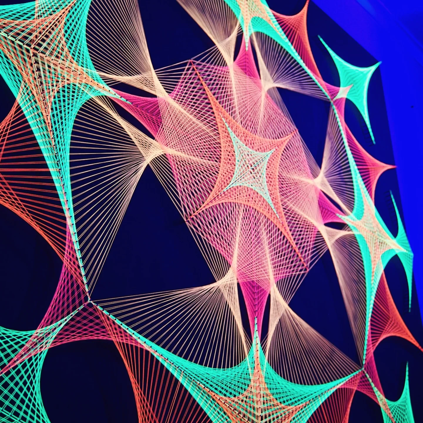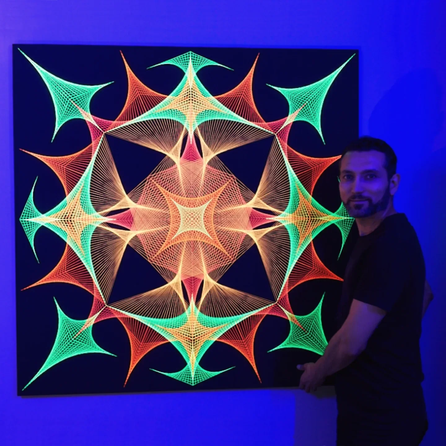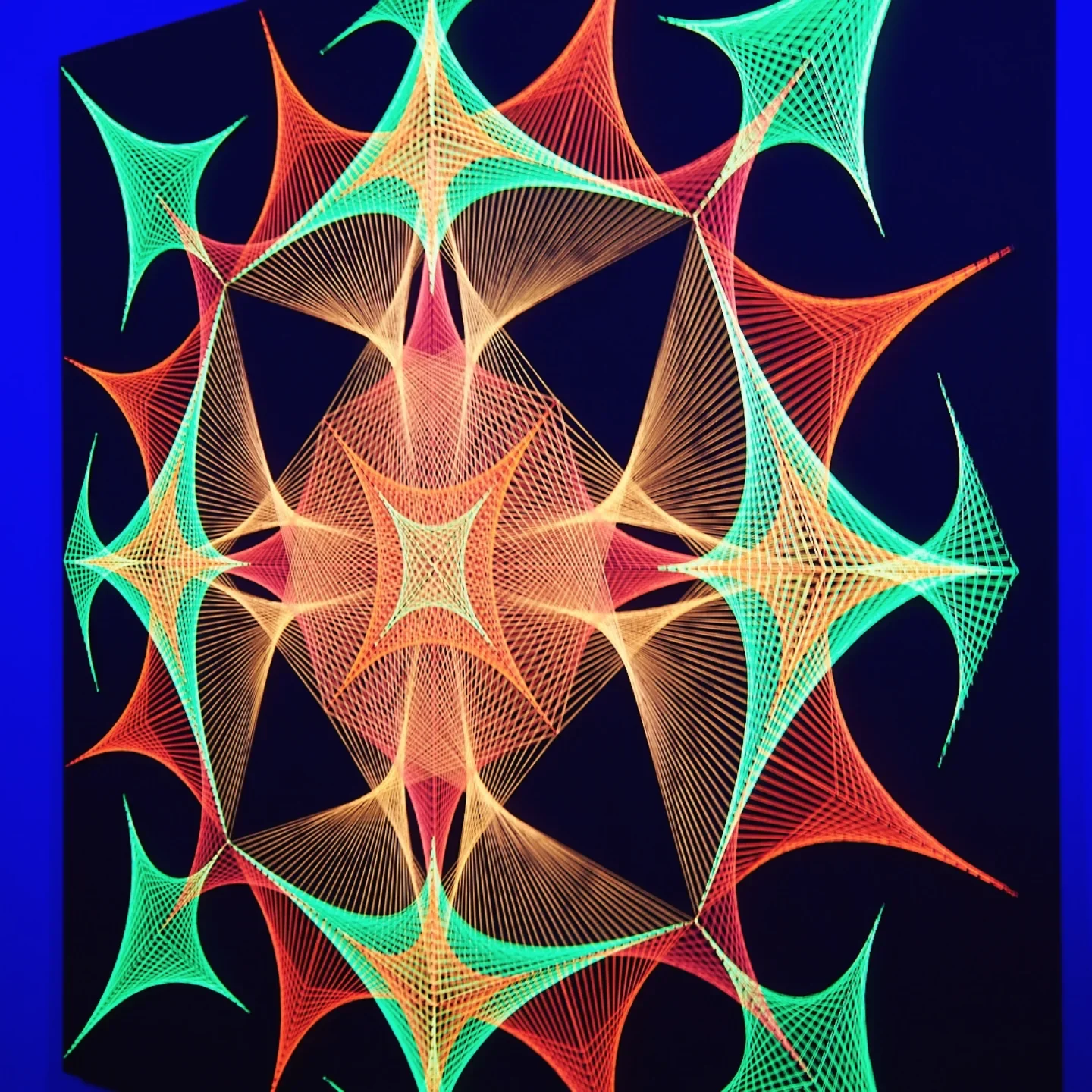 Explosión Octogonal Flúor 120×120 cm es una obra de arte de gran impacto visual, diseñada para llenar cualquier ambiente de energía, movimiento y luz. Confeccionada completamente a mano, esta pieza combina la precisión de la geometría sagrada con un entramado perfecto de hilos flúor que se expanden desde el centro hacia los ocho vértices del octágono, creando un efecto explosivo, dinámico y envolvente.