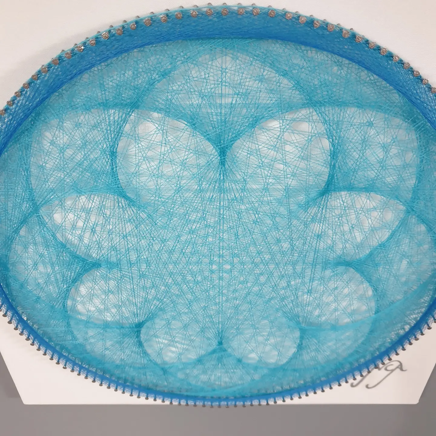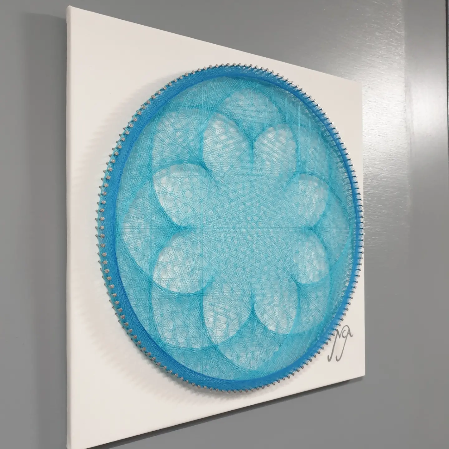 Los hilos tensados con precisión sobre madera, generan un movimiento hipnótico que invita a la contemplación. Su color transmite calma y frescura, evocando el fluir del agua y la serenidad interior.