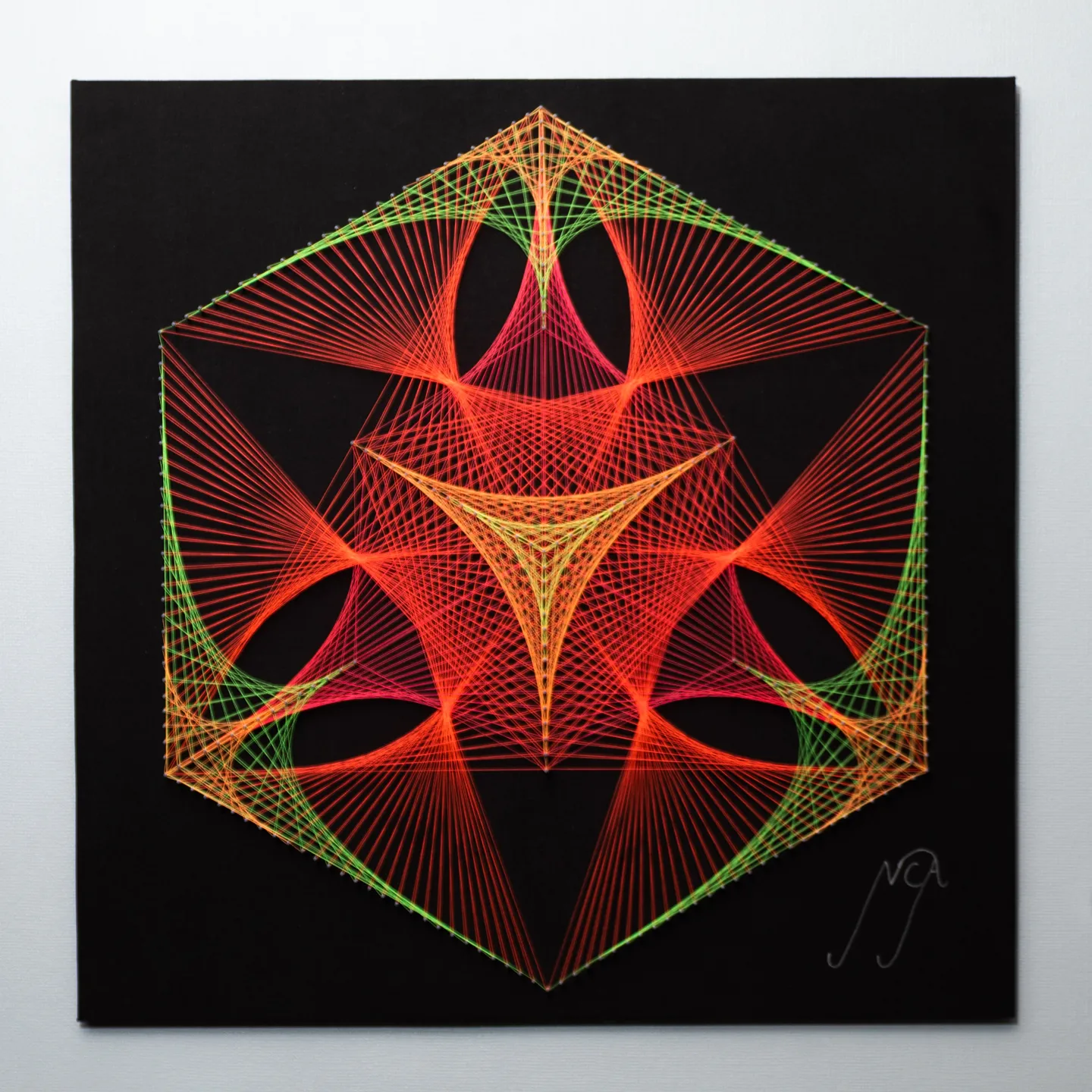 Inspirado en el poder del hexágono, símbolo universal de conexión, equilibrio y expansión, este cuadro está tejido con hilos flúor que resplandecen con fuerza bajo diferentes condiciones de luz, evocando vibración, energía y frecuencia visual.