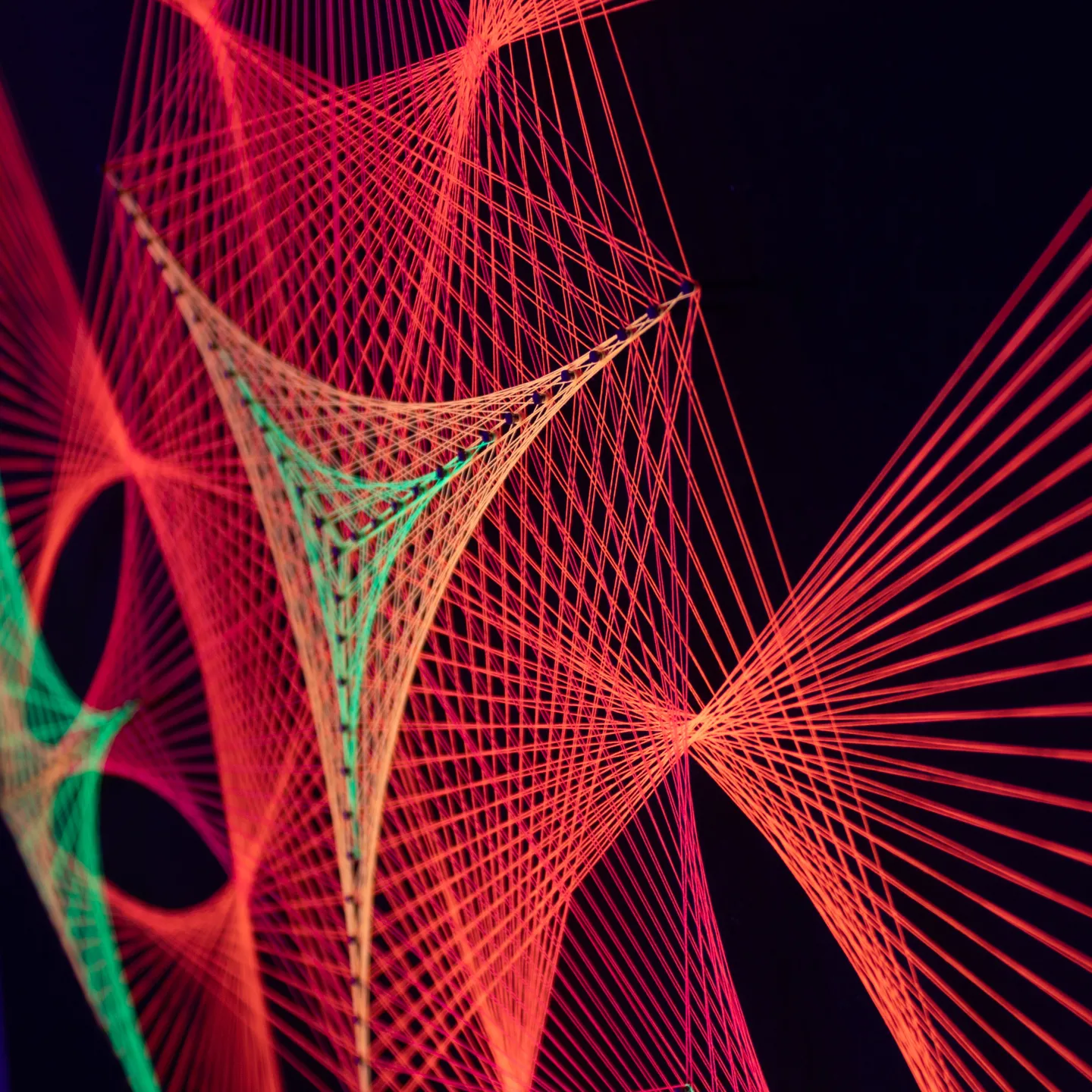 Cada hebra está tensada con propósito, siguiendo patrones matemáticos que dan forma a una figura viva y armónica. Su entramado parece moverse con la luz, transmitiendo una sensación de fluidez, orden y energía positiva.