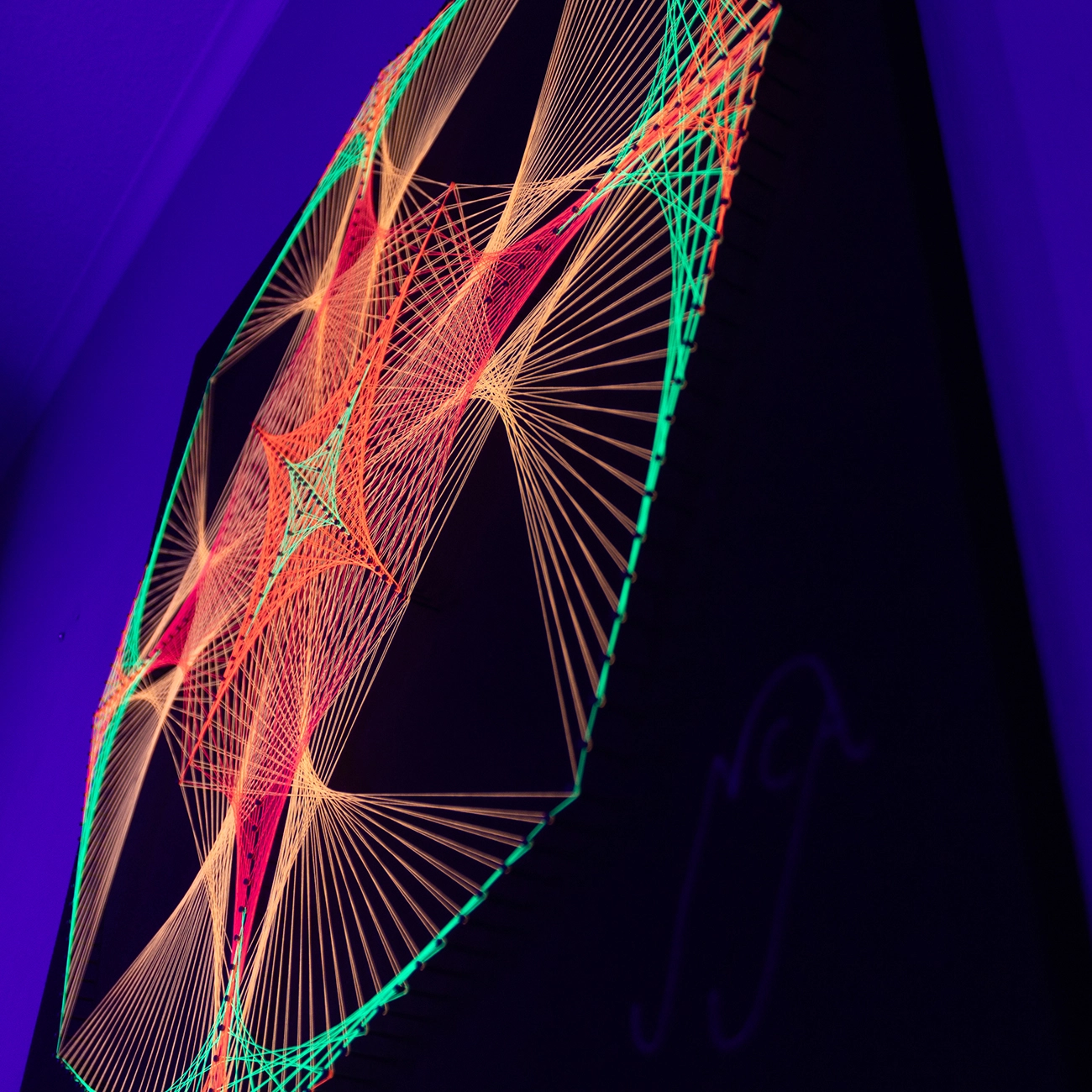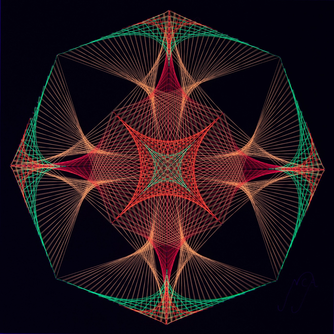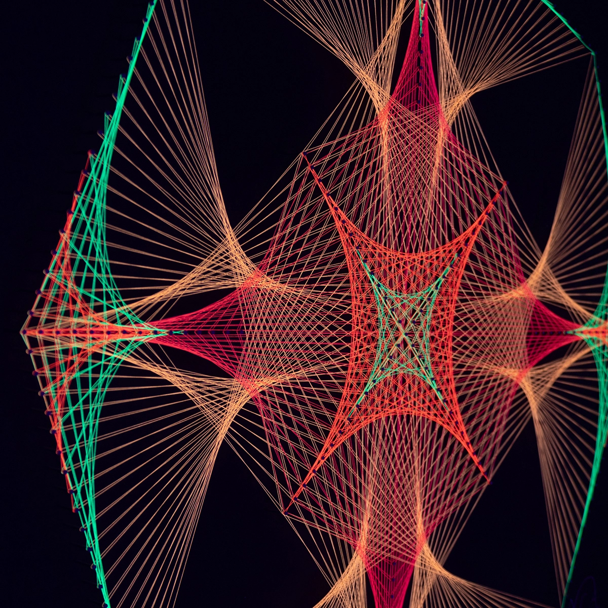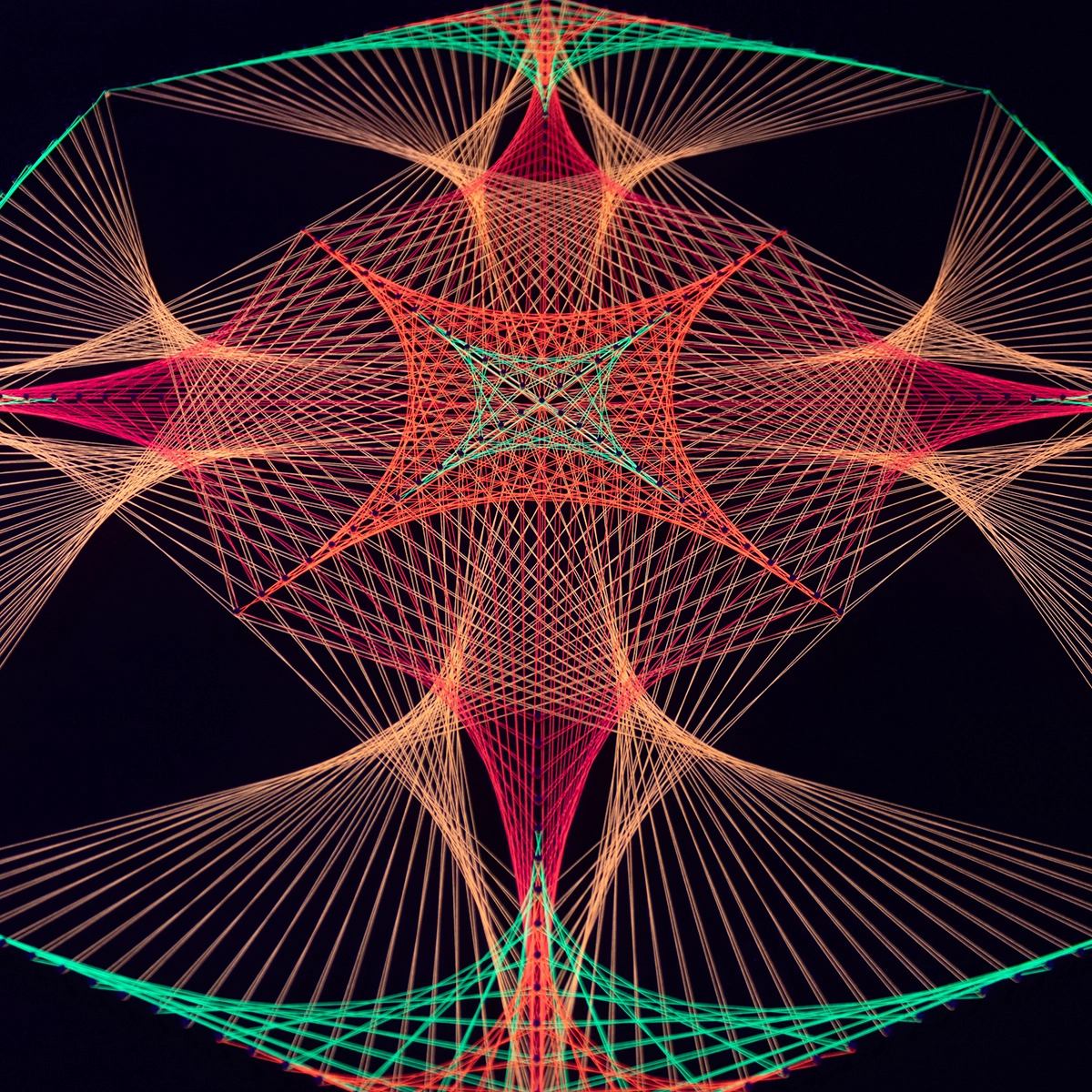 Octágono Flamas Flúor es una obra exclusiva diseñada y construida completamente a mano, combinando geometría sagrada, técnica de e hilos flúor de la más alta calidad. Cada línea y cada tensión está creada a partir de mis más 5 años de experiencia desarrollando cuadros luminosos, precisos y llenos de energía.
